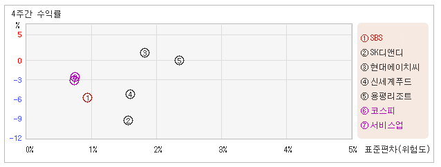 | 관련종목들 가운데서 변동폭은 높지만 수익률은 작아 23일 오전 9시35분 현재 전일대비 1.27% 하락하면서 27,300원을 기록하고 있는 SBS는 지난 1개월간 7.3% 하락했다. 동기간 동안에 주가움직임의 위험지표인 표준편차는 0.9%를 기록했다. 이는 코스피 업종내에서 주요종목들과 비교해볼 때 SBS의 월간 변동성이 가장 작았던 만큼 주가하락률도 주요종목군 내에서 상대적으로 낮았다는 것을 의미한다. 최근 1개월을 기준으로 SBS의 위험을 고려한 수익률은 -8.1을 기록했는데, 변동성은 가장 낮았지만 주가가 하락했기 때문에 위험대비 수익률은 가장 저조한 수준을 나타냈다. 게다가 코스피업종의 위험대비수익률 -4.5보다도 낮기 때문에 업종대비 성과도 좋지 않았다고 할 수 있다. 다음으로 업종과 시장을 비교해보면 SBS가 속해 있는 코스피업종은 서비스업지수보다 변동성과 등락률이 모두 높은 모습이다. 업종등락률이 마이너스지만 시장보다는 탄력이 있고, 흐름도 좋다. |