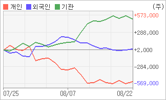 | 외국인/기관 순매수, 개인은 순매도(한달누적) 8월21일부터 전일까지 외국인이 2거래일 연속 순매수를 보였다. 4주간을 기준으로 보면 외국인이 매수 우위를 유지하면서 10,869주를 순매수했고, 기관도 방향성있는 매매를 하면서 519,903주를 순매수했다. 반면 개인들은 매도쪽으로 방향을 잡으면서 530,772주를 순매도한 것으로 나타났다. |