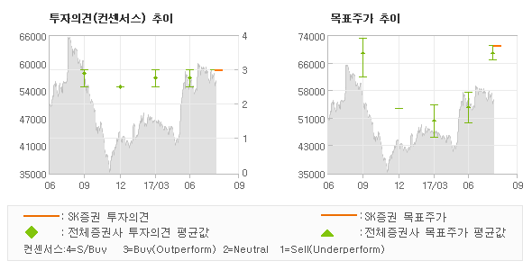 오늘 SK증권에서 발표된 '매수(신규편입)'의견 및 목표주가 71,000원은 전체의견에 수렴하면서 시장의 평균적인 기대감이 비교적 객관적으로 표현된 것으로 풀이되며 목표가평균 대비 2.3% 초과하고 있는 것으로 집계되었다. 참고로 최근 증권사 매매의견 중에서 제일 보수적인 의견을 제시한 삼성증권에서 투자의견 '매수'에 목표주가 67,000원을 제시한 바 있다.