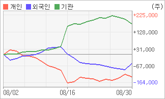 | 외국인과 개인은 순매도, 기관은 순매수(한달누적) 8월28일부터 전일까지 기관이 3거래일 연속 순매도를 보였다. 4주간을 기준으로 보면 기관이 방향성있는 매매를 하면서 178,274주를 순매수한 반면, 외국인은 매도 우위를 지속하면서 51,541주를 순매도했고, 개인들도 초반에 동종목을 순매도한 이후에 근래에는 순매도량을 줄이면서 126,733주를 순매도했다. |