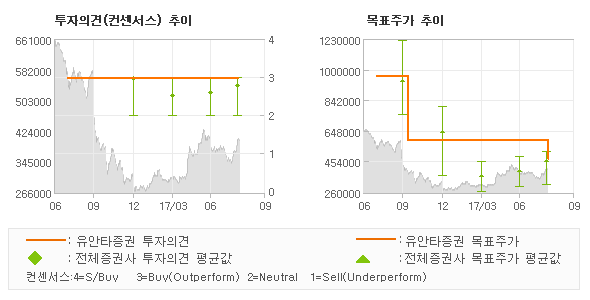 유안타증권의 동종목에 대한 최근 1년동안의 투자의견은 전체적으로 큰 변화없이 유지되고 있다. 목표주가는 2016년7월 1,000,000원까지 높아졌다가 2016년10월 590,000원을 최저점으로 목표가가 제시된 이후 최근에 470,000원으로 새롭게 조정되고 있다.