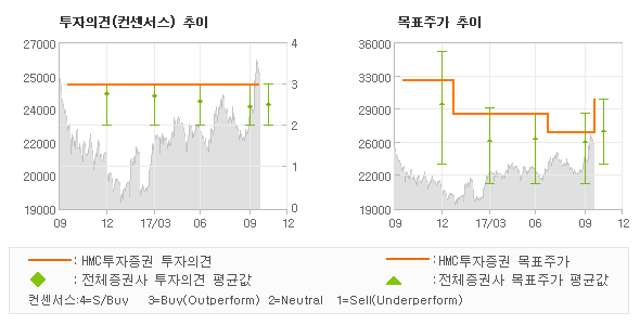 오늘 HMC투자증권에서 발표된 '매수'의견 및 목표주가 30,000원은 전체 컨센서스 대비해서 상대적으로 긍정적인 수준으로서 이는 동종목에 대한 기대감을 보다 강하게 표현한 것으로 풀이되며 목표가평균 대비 16.9% 초과하고 있는 것으로 집계되었다. 참고로 최근에 목표주가를 가장 공격적으로 제시한 신한금융투자에서 투자의견 '매수(유지)'에 목표주가 30,000원을 제일 보수적인 의견을 제시한 이베스트투자증권에서 투자의견 'HOLD(유지)'에 목표주가 21,000원을 제시한 바 있다.