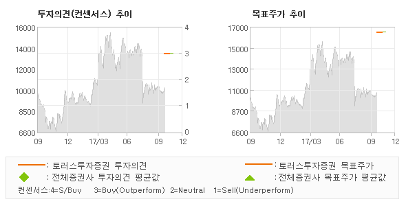 오늘 토러스투자증권에서 발표된 '매수(신규)'의견 및 목표주가 16,500원은 전체의견에 수렴하면서 시장의 평균적인 기대감이 비교적 객관적으로 표현된 것으로 풀이되며 목표가평균과 대비해서 미미한 차이가 나는 것으로 집계되었다. 참고로 최근 증권사 매매의견 중에서 제시한 바 있다.