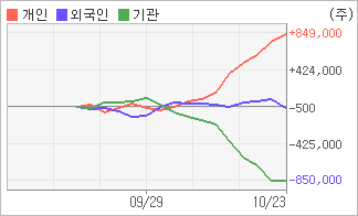| 외국인과 기관은 순매도, 개인은 순매수(한달누적) 전일 기관이 4,887주를 순매수했고, 외국인은 102,377주를 순매도했다. 4주간을 기준으로 보면 외국인이 순매도로 돌아서면서 3,500주를 순매도했고, 기관도 순매수에서 순매도로 반전되면서 844,624주를 순매도했지만, 개인은 오히려 매수반전의 모습을 보이며 848,124주를 순매수했다. |
