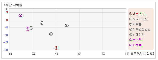 | 관련종목들 가운데 변동폭 커도 수익율은 낮아 27일 오후 2시50분 현재 전일대비 2.97% 오른 27,750원을 기록하고 있는 에코프로는 지난 1개월간 19.57% 하락했다. 같은 기간동안 변동성의 크기를 말해주는 표준편차는 4%를 기록했다. 이는 IT부품 업종내에서 주요종목들과 비교해볼 때 에코프로의 월간 변동성이 상대적으로 커짐과 함께 주가도 마이너스를 보이며 낮은 수준을 유지했다는 뜻이다. 최근 1개월을 기준으로 에코프로의 위험을 고려한 수익률은 -4.8을 기록했는데, 변동성이 높고 주가는 약세를 기록하면서 위험대비 수익률은 가장 저조한 모습을 보였다. 게다가 IT부품업종의 위험대비수익률 -4.2보다도 낮기 때문에 업종대비 성과도 좋지 않았다고 할 수 있다. 다음으로 업종과 시장을 비교해보면 에코프로가 속해 있는 IT부품업종은 코스닥지수보다 변동성은 높고, 등락률은 낮은 모습이다. 하락할 때 지수보다 탄력을 받고 있다는 의미이다. |