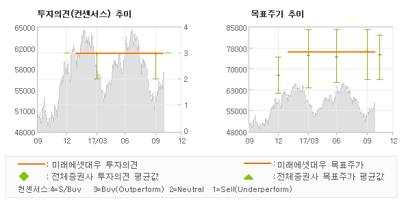 오늘 미래에셋대우에서 발표된 '매수(유지)'의견 및 목표주가 76,000원은 전체 컨센서스 대비해서 대체적으로 평균치에 해당하는 수준으로, 이번 의견은 동종목에 대한 전체적인 흐름에서 크게 벗어나지 않은 것으로 파악되며 목표가평균 대비 3.5% 초과하고 있는 것으로 집계되었다. 참고로 최근에 목표주가를 가장 공격적으로 제시한 HMC투자증권에서 투자의견 '매수'에 목표주가 84,000원을 제일 보수적인 의견을 제시한 대신증권에서 투자의견 '매수'에 목표주가 66,000원을 제시한 바 있다.