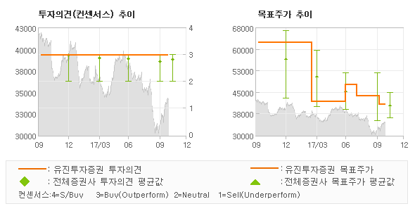 유진투자증권의 동종목에 대한 최근 1년동안의 투자의견은 전체적으로 큰 변화없이 유지되고 있다. 목표주가는 2016년10월 63,000원까지 높아졌다가 2017년10월 41,000원을 최저점으로 목표가가 제시된 이후 최근에도 41,000원으로 제시되고 있다.