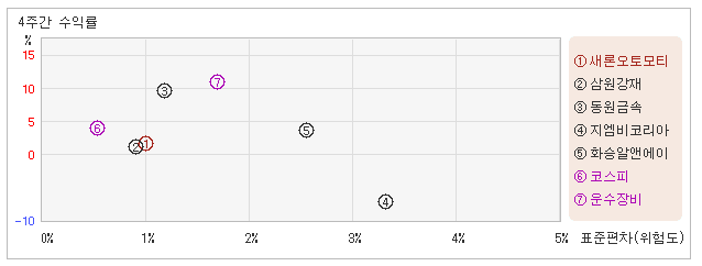 | 업종지수와 비교해서 변동성 대비 성과는 나쁜 편 30일 오전 11시50분 현재 전일대비 1.72% 하락하면서 7,430원을 기록하고 있는 새론오토모티브는 지난 1개월간 1.78% 상승했다. 같은 기간동안 위험를 나타내는 지표인 표준편차는 1%를 기록했다. 이는 코스피 업종내에서 주요종목들과 비교해볼 때 새론오토모티브의 월간 주가수익률은 적정한 수준에 있었지만 변동성은 상대적으로 낮은 수준을 유지했다는 뜻이다. 최근 1개월을 기준으로 새론오토모티브의 위험을 고려한 수익률은 1.7을 기록했는데, 변동성이 낮은 상태에서 주가흐름은 양호했기 때문에 위험대비 수익률은 높은 수준을 유지했다. 다만 코스피업종의 위험대비수익률 8.0보다는 낮았기 때문에 업종대비 성과는 뛰어났다고 할 수 없다. 다음으로 업종과 시장을 비교해보면 새론오토모티브가 속해 있는 코스피업종은 운수장비지수보다 변동성과 수익률이 모두 낮은 모습을 보여주고 있다. 다시 말해서 동업종의 탄력이 떨어지면서 업종상승률도 미진했다는 의미이다. |