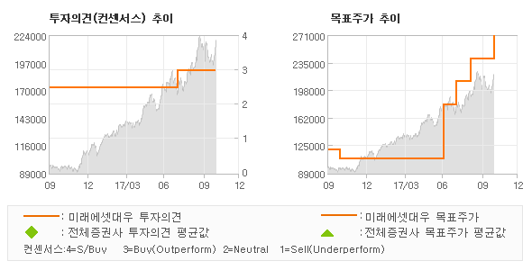 오늘 미래에셋대우에서 발표된 '매수(유지)'의견 및 목표주가 270,000원은 전체의견에 수렴하면서 시장의 평균적인 기대감이 비교적 객관적으로 표현된 것으로 풀이되며 목표가평균 대비 14.9% 초과하고 있는 것으로 집계되었다. 참고로 최근 증권사 매매의견 중에서 제일 보수적인 의견을 제시한 이베스트투자증권에서 투자의견 'HOLD(유지)'에 목표주가 170,000원을 제시한 바 있다.