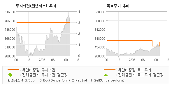 유안타증권의 동종목에 대한 최근 3개월 동안의 투자의견은 전체적으로 큰 변화없이 유지되고 있다. 목표주가는 2016년10월 590,000원까지 높아졌다가 2017년8월 470,000원을 최저점으로 목표가가 제시된 이후 최근에 550,000원으로 새롭게 조정되고 있다.