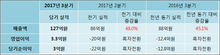 11월 01일 알비케이이엠디(106080)의 2017년 3분기 연결 확정 실적이 발표됐다. 작년 동기 대비해서 매출액은 45.13% 상승하여 127억원을 기록했다. 영업이익은 3.3억원으로 -12.4억원에서 흑자전환되었다. 당기순이익은 3억원으로 -12.8억원에서 흑자전환되었다.