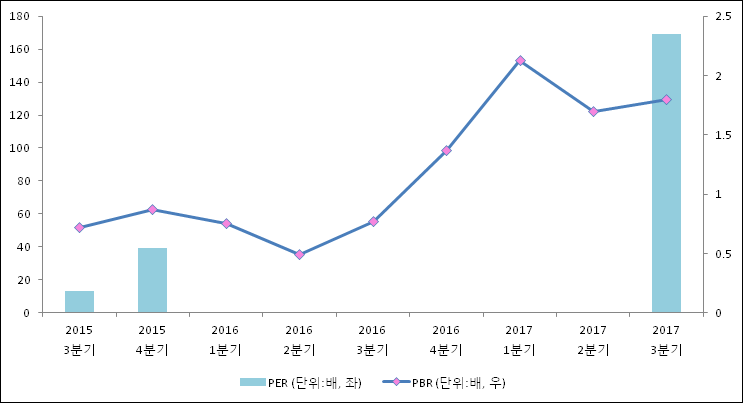 주가가 1주당 수익의 몇배가 되는지 나타내는 주가수익비율(PER)은 169배로 나타났다.주가가 1주당 순자산의 몇배인지 알려주는 주가순자산비율인 PBR은 1.8배이다. 지난해 동기 PBR은 0.77배로 이번 3분기 PBR이 상승했다.