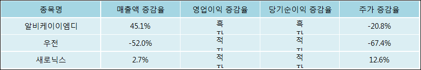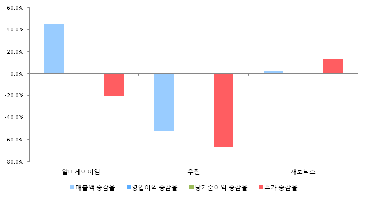 다음은 알비케이이엠디와 동일 업종 내 비교 그룹 종목의 각각 최근 실적의 전년 동기 대비 성장률이다. 알비케이이엠디의 매출액 증감율은 타 종목 대비 가장 우수한 편이다. 그리고 주가는 하락하였지만 가장 나은 상승률을 기록하였다.