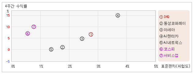 | 업종평균에 비해서 변동폭 대비 수익률은 다소 부정적 3일 오후 12시55분 현재 전일대비 3.09% 오른 2,000원을 기록하고 있는 IHQ는 지난 1개월간 6.67% 상승했다. 같은 기간동안 변동성의 크기를 말해주는 표준편차는 2.7%를 기록했다. 이는 코스피 업종내에서 주요종목들과 비교해볼 때 IHQ의 월간 주가수익률이 상당히 높았던 만큼 변동성도 다소 높은 수준을 유지했다는 뜻이다. 최근 1개월을 기준으로 IHQ의 위험을 고려한 수익률은 2.4를 기록했는데, 변동성은 높았으나 주가흐름이 괜찮았기 때문에 위험대비 수익률은 높은 수준을 유지했다. 다만 코스피업종의 위험대비수익률 14.2보다는 낮았기 때문에 업종대비 성과는 뛰어났다고 할 수 없다. 다음으로 업종과 시장을 비교해보면 IHQ가 속해 있는 코스피업종은 서비스업지수보다 변동성과 수익률이 모두 낮은 모습을 보여주고 있다. 다시 말해서 동업종의 탄력이 떨어지면서 업종상승률도 미진했다는 의미이다. |