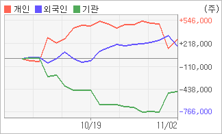 | 외국인/개인 순매수, 기관은 순매도(한달누적) 11월1일부터 전일까지 기관이 2거래일 연속 순매수했다. 4주간을 기준으로 보면 외국인이 초반에 동종목을 순매수한 이후에 기세를 이어가며 191,415주를 순매수했고, 개인들도 매기를 떨어뜨리면서도 274,593주를 순매수했다. 하지만 기관은 매도 우위를 보이면서 466,008주를 순매도했다. |