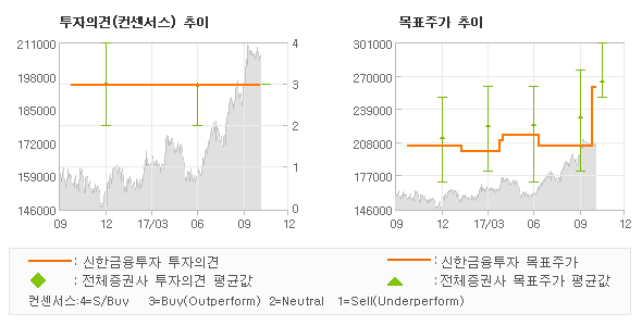신한금융투자의 동종목에 대한 최근 1년동안의 투자의견은 전체적으로 큰 변화없이 유지되고 있다. 목표주가는 2016년10월 200,000원이 저점으로 제시된 이후에 최근에는 260,000원까지 상향조정되고 있다.