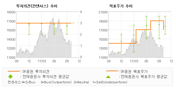SK증권의 동종목에 대한 최근 1년동안의 투자의견은 전체적으로 큰 변화없이 유지되고 있다. 목표주가는 2016년10월 14,000원이 저점으로 제시된 이후 2017년7월 19,000원을 최고점으로 목표가가 제시되었고 최근에는 17,000원으로 다소 하향조정되고 있다.