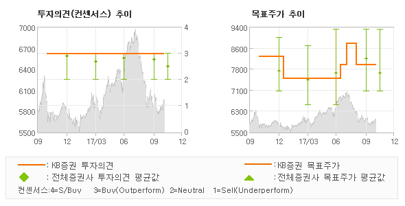 KB증권의 동종목에 대한 최근 1년동안의 투자의견은 전체적으로 큰 변화없이 유지되고 있다. 목표주가는 2017년8월 8,800원까지 높아졌다가 2017년1월 7,500원을 최저점으로 목표가가 제시된 이후 최근에 8,000원으로 새롭게 조정되고 있다.