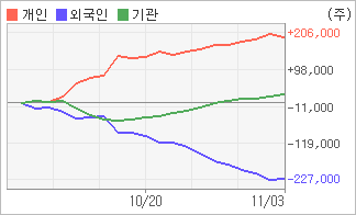| 기관/개인 순매수, 외국인은 순매도(한달누적) 10월19일부터 기관이 12거래일 연속 순매수 행진을 벌이고 있다. 4주간을 기준으로 보면 기관이 순매도를 기록하다가 다시 순매수로 돌아서면서 27,667주를 순매수했고, 개인들도 순매수량을 늘리며 194,235주를 순매수했다. 반면 그 동안 외국인은 매도 우위를 지속하면서 221,902주를 순매도했다. |