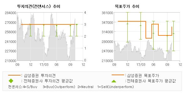 삼성증권의 동종목에 대한 최근 1년동안의 투자의견은 전체적으로 큰 변화없이 유지되고 있다. 목표주가는 2016년10월 350,000원까지 높아졌다가 2017년5월 290,000원을 최저점으로 목표가가 제시된 이후 최근에 330,000원으로 새롭게 조정되고 있다.
