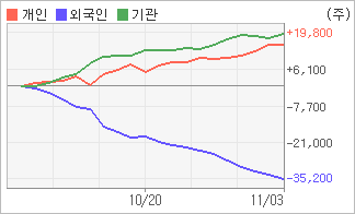 | 기관/개인 순매수, 외국인은 순매도(한달누적) 10월23일부터 외국인들이 10거래일 연속 순매도 행진을 벌이고 있다. 4주간을 기준으로 보면 기관이 방향성있는 매매를 하면서 19,738주를 순매수했고, 개인들도 순매수량을 늘리며 15,372주를 순매수했다. 반면 그 동안 외국인은 매도 우위를 지속하면서 35,110주를 순매도했다. |