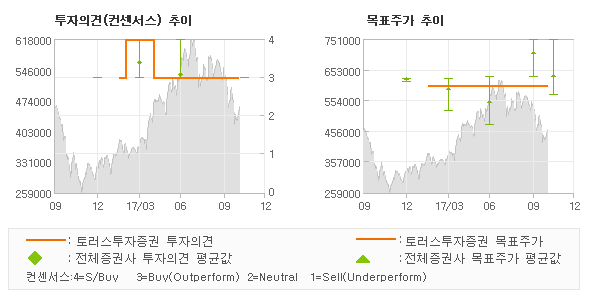 오늘 토러스투자증권에서 발표된 '매수(유지)'의견 및 목표주가 600,000원은 전체의견에 수렴하면서 시장의 평균적인 기대감이 비교적 객관적으로 표현된 것으로 풀이되며 목표가평균과 대비해서 미미한 차이가 나는 것으로 집계되었다. 참고로 최근에 목표주가를 가장 공격적으로 제시한 신영증권에서 투자의견 '매수(유지)'에 목표주가 750,000원을 제일 보수적인 의견을 제시한 한국투자증권에서 투자의견 '매수(신규)'에 목표주가 570,000원을 제시한 바 있다.