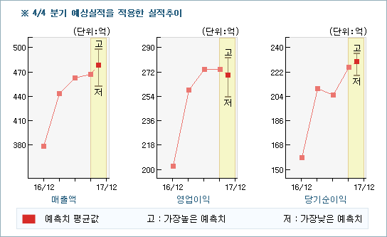 토러스투자증권에서 내놓은 의견에 따르면 휴젤의 4분기 예상실적은 매출액이 487억원으로 전년동기와 비교해서 28.84% 증가, 영업이익은 269억원으로 33.3% 증가, 그리고 당기순이익은 231억원으로 46.02%정도의 증가가 예상되고 있다. 또한 이를 직전분기에 맞추어본다면 매출액은 17.07%증가, 영업이익 13.5%증가, 그리고 당기순이익은 20.31%가 증가할 것으로 예측된다.