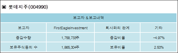 롯데지주(004990)는 06일 기타 FirstEagleInvestment의 보유주식이 감소되었다고 발표했다. 이는 직전 보고일보다 1,758,733주 증가하여 지분율은 2.53%로 상승했다. 이번 보고 사유는 장내매매발행회사의주식분할,분할및분할합병으로 알려졌다.