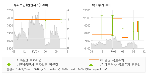 SK증권의 동종목에 대한 최근 1년동안의 투자의견은 전체적으로 큰 변화없이 유지되고 있다. 목표주가는 2017년6월 8,000원까지 내려갔다가 2017년4월 11,500원을 최고점으로 목표가가 제시된 이후 최근에 11,000원으로 한단계 하향조정되고 있다.