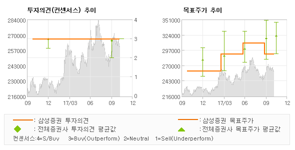 삼성증권의 동종목에 대한 최근 1년동안의 투자의견은 전체적으로 큰 변화없이 유지되고 있다. 목표주가는 2016년10월 260,000원이 저점으로 제시된 이후 2017년6월 310,000원을 최고점으로 목표가가 제시되었고 최근에는 290,000원으로 다소 하향조정되고 있다.