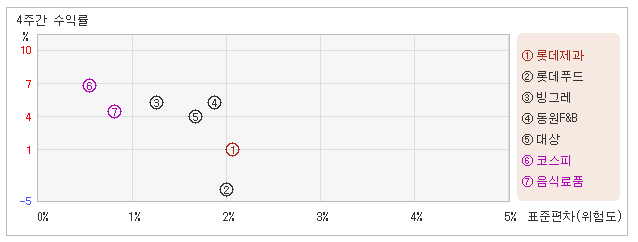 | 관련종목들 가운데 변동폭 작아도 수익율은 높아 7일 오전 9시10분 현재 전일대비 1.81% 오른 169,000원을 기록하고 있는 롯데제과는 같은 기간동안 변동성의 크기를 말해주는 표준편차는 2%를 기록했다. 이는 음식료품 업종내에서 주요종목들과 비교해볼 때 다만 음식료품업종의 위험대비수익률인 4.7보다는 낮기 때문에 업종대비 성과가 좋았다고는 할 수 없다. 다음으로 업종과 시장을 비교해보면 롯데제과가 속해 있는 음식료품업종은 코스피지수보다 변동성은 높고, 수익률은 낮은 모습을 보여주고 있다. 다시 말해서 동업종은 지수보다 크게 오르락 내리락 했지만, 상승률은 오히려 지수보다 못하다는 의미이다. |