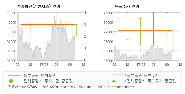 오늘 동부증권에서 발표된 '매수(유지)'의견 및 목표주가 145,000원은 전체 컨센서스 대비해서 대체적으로 평균치에 해당하는 수준으로, 이번 의견은 동종목에 대한 전체적인 흐름에서 크게 벗어나지 않은 것으로 파악되며 목표가평균 대비 7.2% 초과하고 있는 것으로 집계되었다. 참고로 최근에 목표주가를 가장 공격적으로 제시한 케이프투자증권에서 투자의견 '매수(유지)'에 목표주가 153,000원을 제일 보수적인 의견을 제시한 이베스트투자증권에서 투자의견 'HOLD(하향)'에 목표주가 110,000원을 제시한 바 있다.