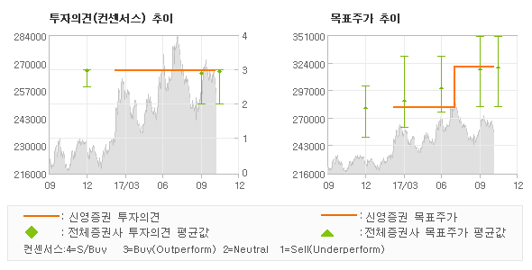신영증권의 동종목에 대한 최근 9개월 동안의 투자의견은 전체적으로 큰 변화없이 유지되고 있다. 목표주가는 2017년3월 280,000원이 저점으로 제시된 이후 이번에 발표된 320,000원까지 꾸준하게 상향조정되어 왔다.