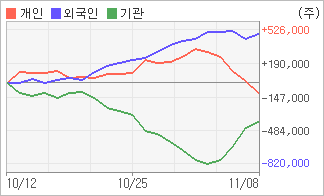 | 기관과 개인은 순매도, 외국인은 순매수(한달누적) 11월3일부터 전일까지 기관이 4거래일 연속 순매수했다. 4주간을 기준으로 보면 외국인이 초반에 동종목을 순매수한 이후에 기세를 이어가며 490,846주를 순매수한 반면, 기관은 매도 우위를 보이면서 392,550주를 순매도했고, 개인들도 매도 우위로 반전되면서 98,296주를 순매도한 것으로 집계됐다. |