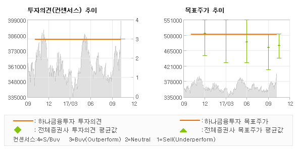 오늘 하나금융투자에서 발표된 '매수'의견 및 목표주가 510,000원은 전체 컨센서스 대비해서 대체적으로 평균치에 해당하는 수준으로, 이번 의견은 동종목에 대한 전체적인 흐름에서 크게 벗어나지 않은 것으로 파악되며 목표가평균 대비 7.2% 초과하고 있는 것으로 집계되었다. 참고로 최근에 목표주가를 가장 공격적으로 제시한 HMC투자증권에서 투자의견 '매수'에 목표주가 510,000원을 제일 보수적인 의견을 제시한 BNK투자증권에서 투자의견 '매수(유지)'에 목표주가 443,000원을 제시한 바 있다.