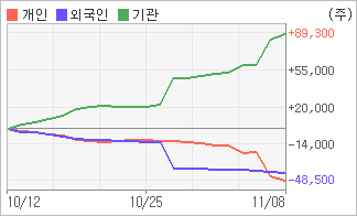 | 외국인과 개인은 순매도, 기관은 순매수(한달누적) 기관이 2일연속 순매수를 보이고 있는 반면에 외국인은 32일연속 순매도를 보이고 있다. 4주간을 기준으로 보면 기관이 방향성있는 매매를 하면서 89,262주를 순매수한 반면, 외국인은 매도 우위를 지속하면서 40,839주를 순매도했고, 개인들도 매도쪽으로 방향을 잡으면서 48,423주를 순매도했다. |