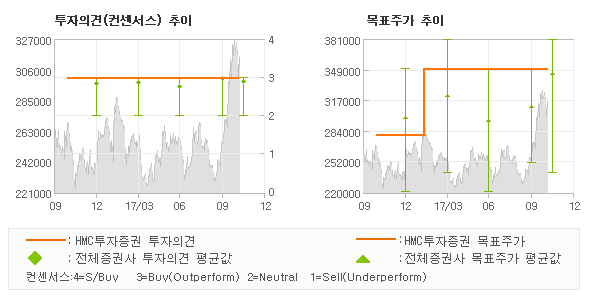 오늘 HMC투자증권에서 발표된 '매수'의견 및 목표주가 350,000원은 전체의견에 수렴하면서 시장의 평균적인 기대감이 비교적 객관적으로 표현된 것으로 풀이되며 목표가평균과 대비해서 미미한 차이가 나는 것으로 집계되었다. 참고로 최근에 목표주가를 가장 공격적으로 제시한 NH투자증권에서 투자의견 '매수(유지)'에 목표주가 380,000원을 제일 보수적인 의견을 제시한 유진투자증권에서 투자의견 'HOLD(유지)'에 목표주가 240,000원을 제시한 바 있다.