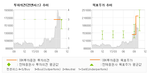 오늘 IBK투자증권에서 발표된 '매수(유지)'의견 및 목표주가 225,000원은 전체 컨센서스 대비해서 대체적으로 평균치에 해당하는 수준으로, 이번 의견은 동종목에 대한 전체적인 흐름에서 크게 벗어나지 않은 것으로 파악되며 목표가평균 대비 11.4% 초과하고 있는 것으로 집계되었다. 참고로 최근에 목표주가를 가장 공격적으로 제시한 이베스트투자증권에서 투자의견 '매수(유지)'에 목표주가 250,000원을 제일 보수적인 의견을 제시한 대신증권에서 투자의견 '매수(신규)'에 목표주가 143,000원을 제시한 바 있다.