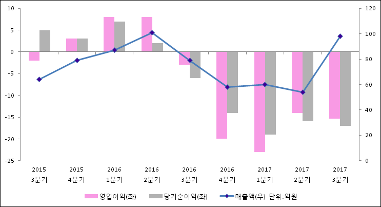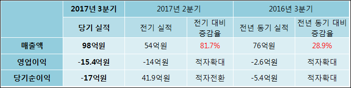 11월 09일 엑세스바이오(950130)의 2017년 3분기 연결 확정 실적이 발표됐다. 전년 같은 기간 대비해서 매출액은 28.85% 상승하여 98억원을 기록했다. 영업이익은 -2.6억원에서 -15.4억원으로 적자폭이 확대되었다고 발표했다. 당기순이익은 -5.4억원에서-17억원으로 적자확대되었다고 발표했다.