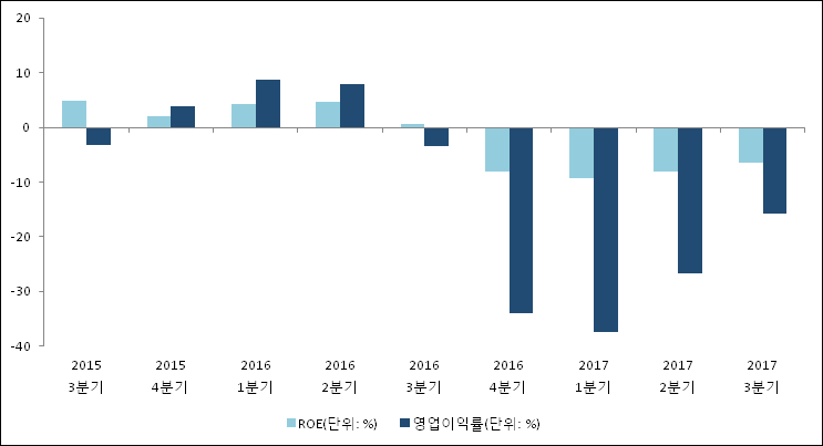 이번분기 기준으로 추정되는 엑세스바이오의 자기자본이익률(ROE)은 -6.4%로 나타났다. 이는 최근 일년과 비교했을 때 급락한 수치이다. 3분기 자기자본은 하락하였으나 당기순이익 하락폭이 더 컸기 때문이다. 전년 동기인 2016년 3분기 ROE는 0.7%로 이번 분기에 7.1%p 하락했다. 한편 동종목의영업이익률은 -15.7%이다. 4분기 이상 연속으로 하락하다 저번 분기부터 반등하여 이번 분기에도 상승했다. 지난해 동기 영업이익률은 -3.4%로 이번 3분기에 12.3%p 하락했다.