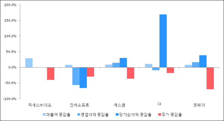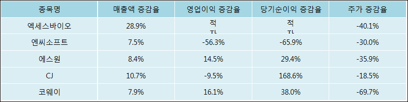 다음은 엑세스바이오와 동일 업종 내 비교 그룹 종목의 각각 최근 실적의 전년 동기 대비 성장률이다. 엑세스바이오의 매출액 증감율은 타 종목 대비 가장 우수한 편이다. 그리고 주가의 하락율이 비교적 큰 편으로 나타났다.