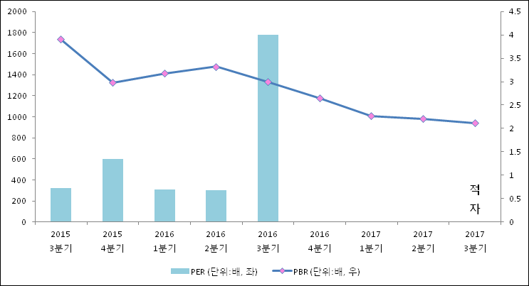 주가가 1주당 순자산의 몇배인지 알려주는 주가순자산비율인 PBR은 2.12배이다. PBR은 최근 5분기 이상 연속으로 하락하고 있다. 지난해 동기 PBR은 3배로 이번 3분기 PBR이 하락했다.