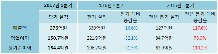 11월 10일 펄어비스(263750)의 2017년 1분기 연결 잠정 실적이 발표됐다. 전년 동기 대비해서 매출액, 영업이익, 당기순이익 모두 증가하였다. 127억원이었던 매출액은 117.6% 증가하여 276억원을 기록했다. 영업이익은 78% 상승하여 150.7억원이고, 당기순이익은 134.4억원으로 발표됐다.