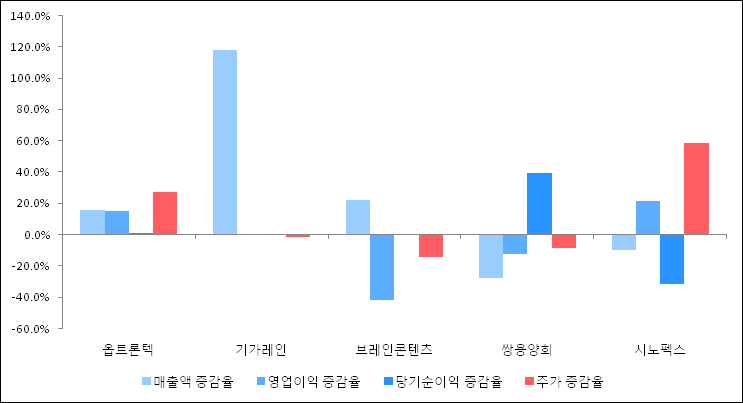 다음은 펄어비스와 동일 업종 내 비교 그룹 종목의 각각 최근 실적의 전년 동기 대비 성장률이다. 펄어비스의 매출액 증감율은 타 종목 대비 가장 우수한 편이다. 그리고 주가는 가장 높은 상승률을 보였다.