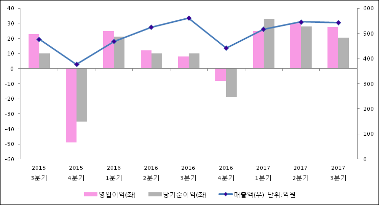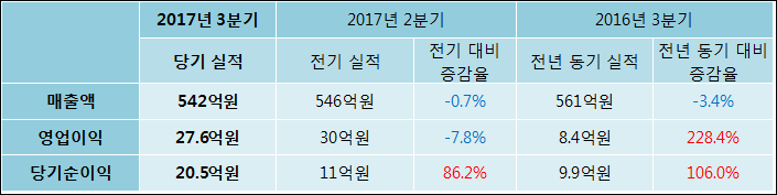 11월 10일 삼화전기(009470)의 2017년 3분기 연결 확정 실적이 발표됐다. 지난해 같은 기간 대비해서 매출액은 542억원으로 3.4% 하락하였다. 그럼에도 영업이익은 228.38% 증가하여 27.6억원으로 발표됐다. 당기순이익 역시 20.5억원으로 106.04% 상승하였다.