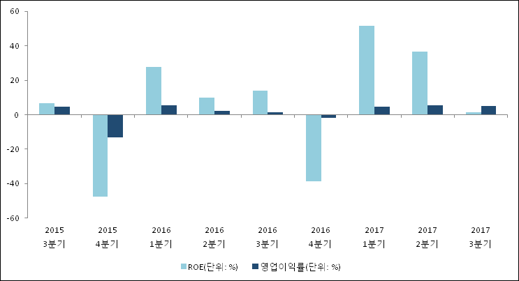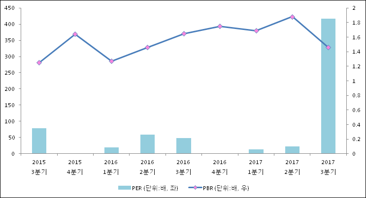 주가가 1주당 수익의 몇배가 되는지 나타내는 주가수익비율(PER)은 417.4배로 나타났다. 전년 동기 PER은 47.44배로 이번 분기에 상승했다.주가가 1주당 순자산의 몇배인지 알려주는 주가순자산비율인 PBR은 1.46배이다. 지난해 동기 PBR은 1.65배로 이번 3분기 PBR이 하락했다.