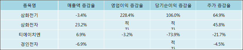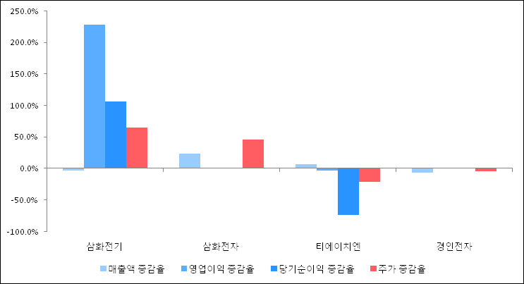 다음은 삼화전기와 동일 업종 내 비교 그룹 종목의 각각 최근 실적의 전년 동기 대비 성장률이다. 삼화전기의 매출액 증감율은 타 종목 대비 가장 저조한 편이다. 그리고 주가는 가장 높은 상승률을 보였다.