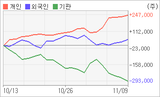 | 외국인/개인 순매수, 기관은 순매도(한달누적) 기관이 5일연속 주식을 팔고 있는 반면 외국인은 3일연속 주식을 사고 있다. 4주간을 기준으로 보면 외국인이 매수 우위를 유지하면서 45,958주를 순매수했고, 개인들도 순매수량을 늘리며 246,396주를 순매수했다. 하지만 기관은 매도 관점으로 접근하면서 292,354주를 순매도했다. |