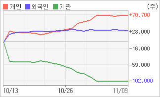 | 외국인/개인 순매수, 기관은 순매도(한달누적) 11월8일부터 전일까지 외국인이 2거래일 연속 순매도했다. 4주간을 기준으로 보면 외국인이 매수 우위를 유지하면서 30,263주를 순매수했고, 개인들도 순매수량을 늘리며 70,698주를 순매수했다. 하지만 기관은 매도 관점으로 접근하면서 100,961주를 순매도했다. |