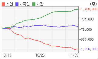 | 외국인/기관 순매수, 개인은 순매도(한달누적) 11월8일부터 전일까지 기관이 2거래일 연속 순매수했다. 4주간을 기준으로 보면 외국인이 매수 우위를 유지하면서 119,324주를 순매수했고, 기관도 방향성있는 매매를 하면서 1,479,919주를 순매수했다. 반면 개인들은 매도쪽으로 방향을 잡으면서 1,599,243주를 순매도한 것으로 나타났다. |
